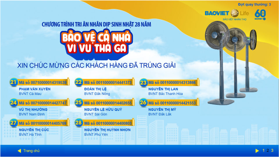 Ngay sau buổi lễ quay thưởng, Bảo Việt Nhân thọ sẽ thực hiện các thủ tục trao giải thưởng đến tận tay khách hàng trúng giải theo đúng thể lệ của chương trình. Cảm ơn tất cả Quý khách hàng đã ủng hộ nồng nhiệt cho chương trình "Bảo vệ cả nhà - Vi vu thả ga" trong 3 tháng vừa qua.